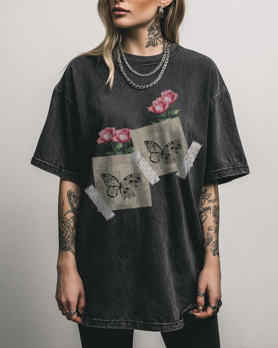 Looking for a blend of natural beauty and contemporary art? Adorn yourself with this elegant ‘Butterfly printed on a magazine and roses’ design. This graphic combines the delicate beauty of a butterfly with the classic allure of roses, all presented with a unique, modern twist of being printed on a magazine page with adhesive tape….
