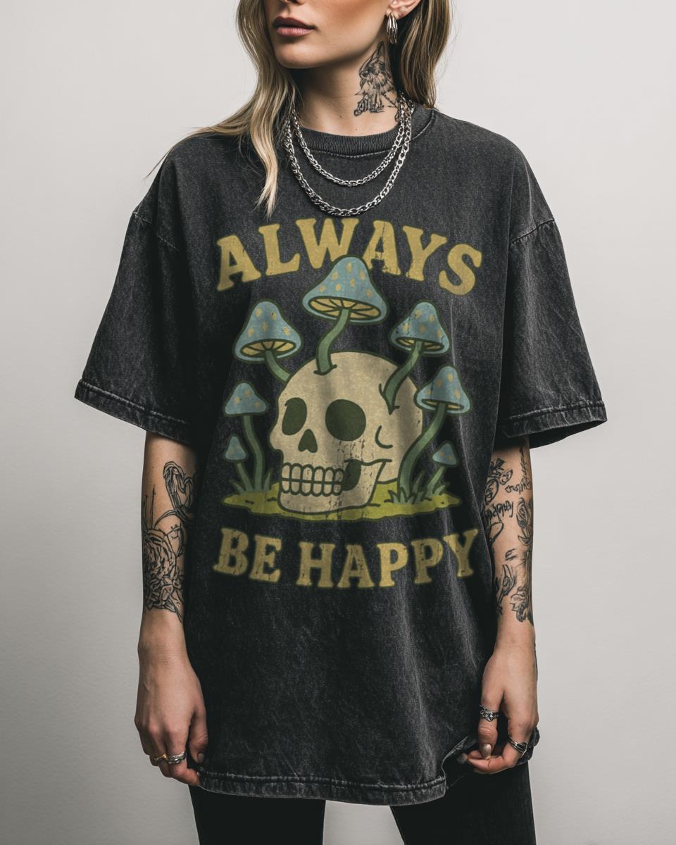 Looking for a unique blend of spooky charm and whimsical nature? Embrace the paradox of joy and darkness with this “Always Be Happy” t-shirt, featuring a delightful design of a happy skull surrounded by magical mushrooms. This piece perfectly blends aesthetic goth with cottagecore spooky, creating a creepy-cute vibe reminiscent of Ghibli and surreal humor….