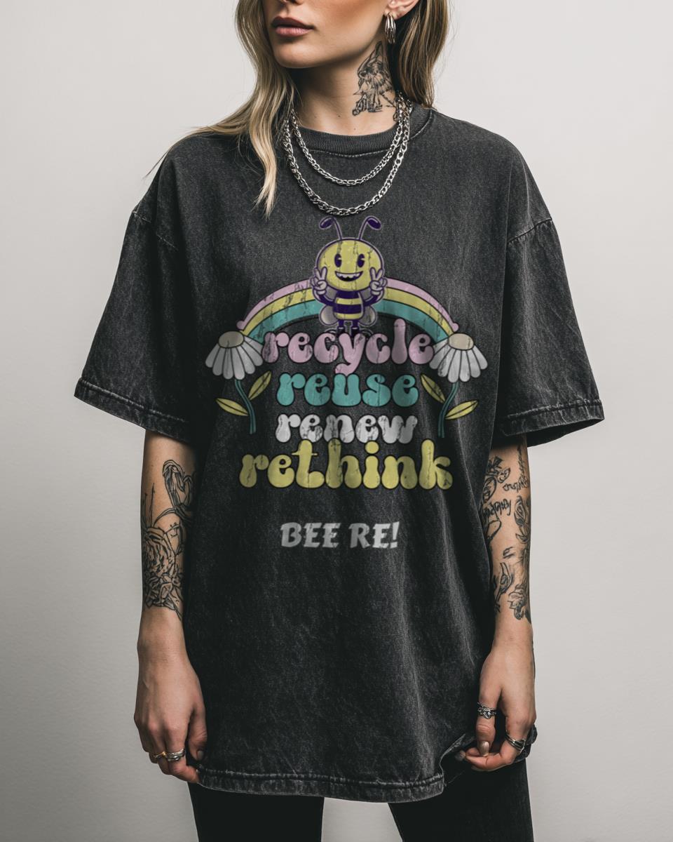 Buzzing with passion for the environment? This adorable “Recycle Reuse Renew Rethink BEE RE” graphic T-shirt combines a vital eco-message with a charming bee motif. It’s a sweet and stylish way to show your love for nature, promote sustainable living, and advocate for our planet’s future. Why You’ll Love This Eco-Bee Tee: High-quality printed graphics…