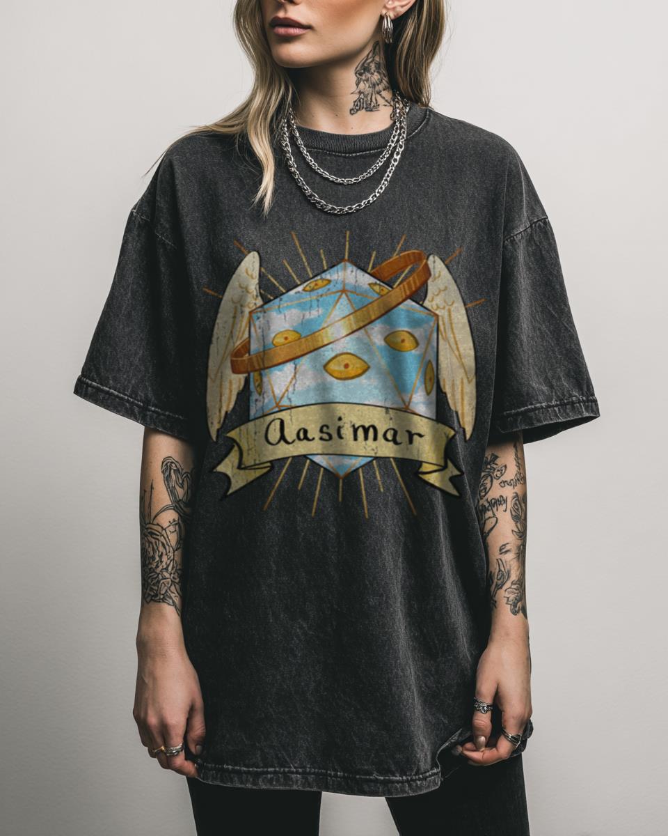 What Makes This Aasimar Dungeons & Dragons T-Shirt Essential? Show your celestial heritage with this captivating Aasimar Dungeons & Dragons T-shirt. Featuring a design inspired by the angelic Aasimar race from your favorite TTRPG, this black acidwash tee is perfect for any D&D nerd. Key Highlights of This D&D Fan Tee: Fantasy Aasimar Design: Showcases…