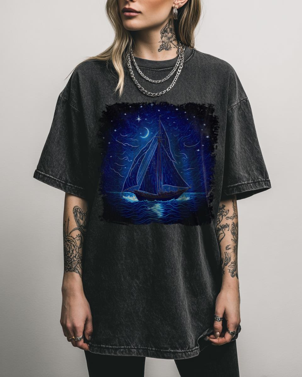 Dreaming of a serene voyage under a sky full of stars? This enchanting graphic captures the timeless beauty of a sailboat adrift on a moonlit ocean, reminiscent of a Starry Night painting. It’s a poetic blend of nautical adventure and classic impressionist art, perfect for dreamers and art enthusiasts alike. Why You’ll Love This: Artistic…