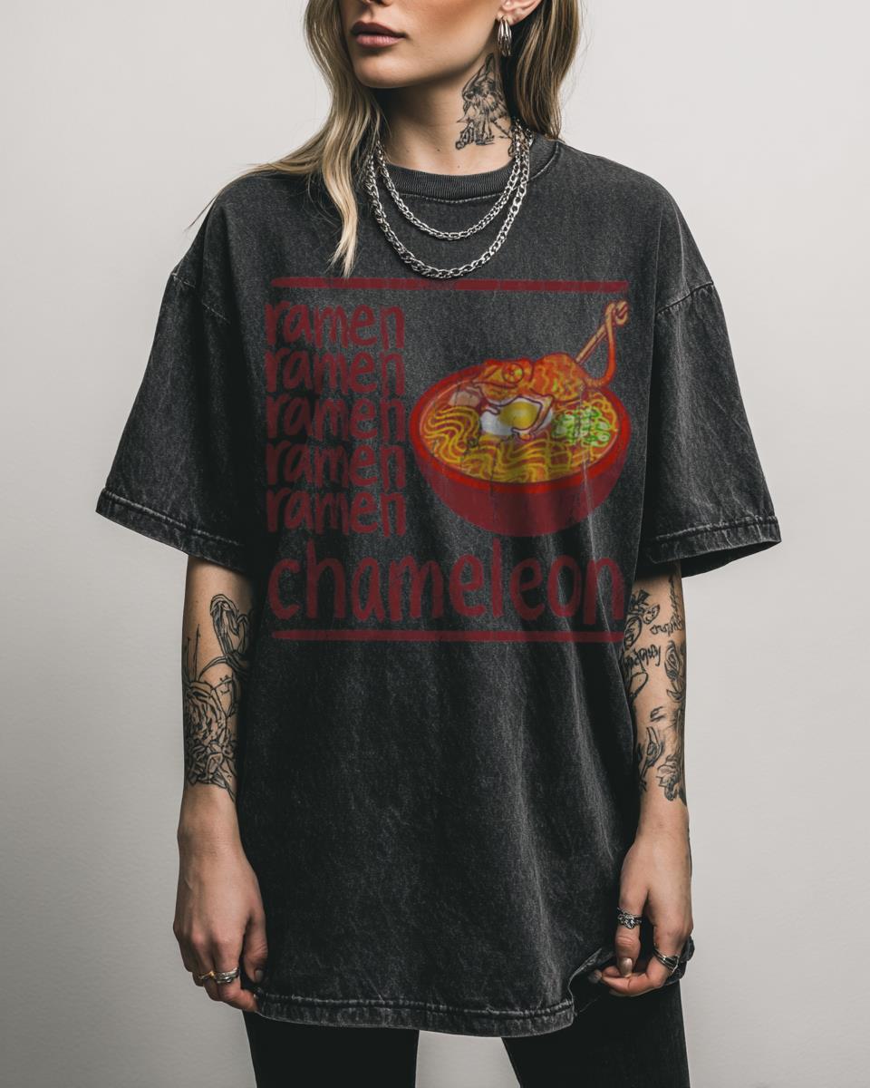 Do you love ramen so much you could sing about it? Get ready for a delicious dose of retro humor with this “RamenRamenRamenRamenRamen Chameleon” T-Shirt! This clever design features a cute chameleon blending in with a ramen bowl, complete with a punny nod to a classic 80s song. Perfect for ramen lovers, pun enthusiasts, and…