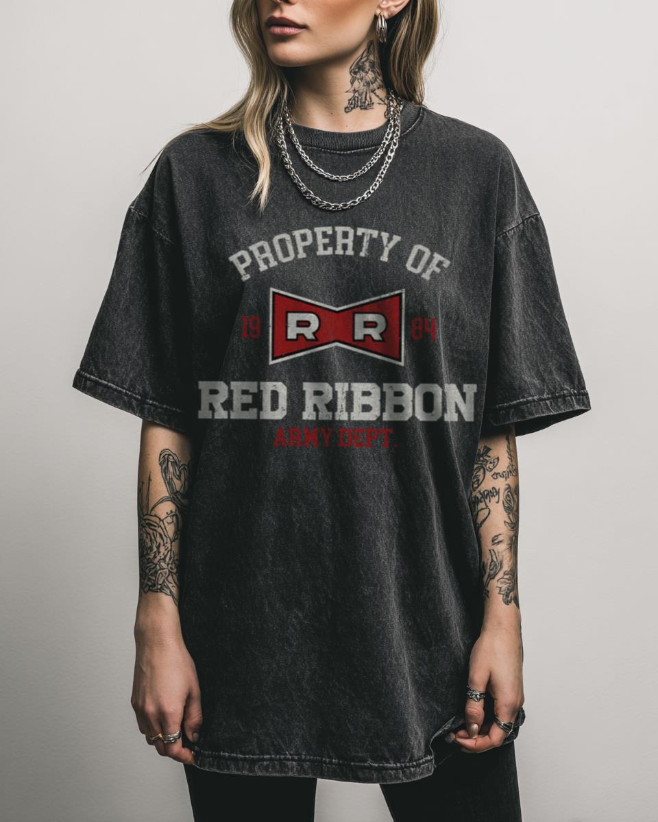 Show Your Loyalty with This Red Ribbon Army Anime T-Shirt! Step back into the classic era of Japanese animation with this Red Ribbon Army Anime T-Shirt. Featuring a bold “Property of Red Ribbon” graphic on a striking black acidwash background, this fan-created tee is a perfect nostalgic piece for any 80s anime and Dragon Ball…
