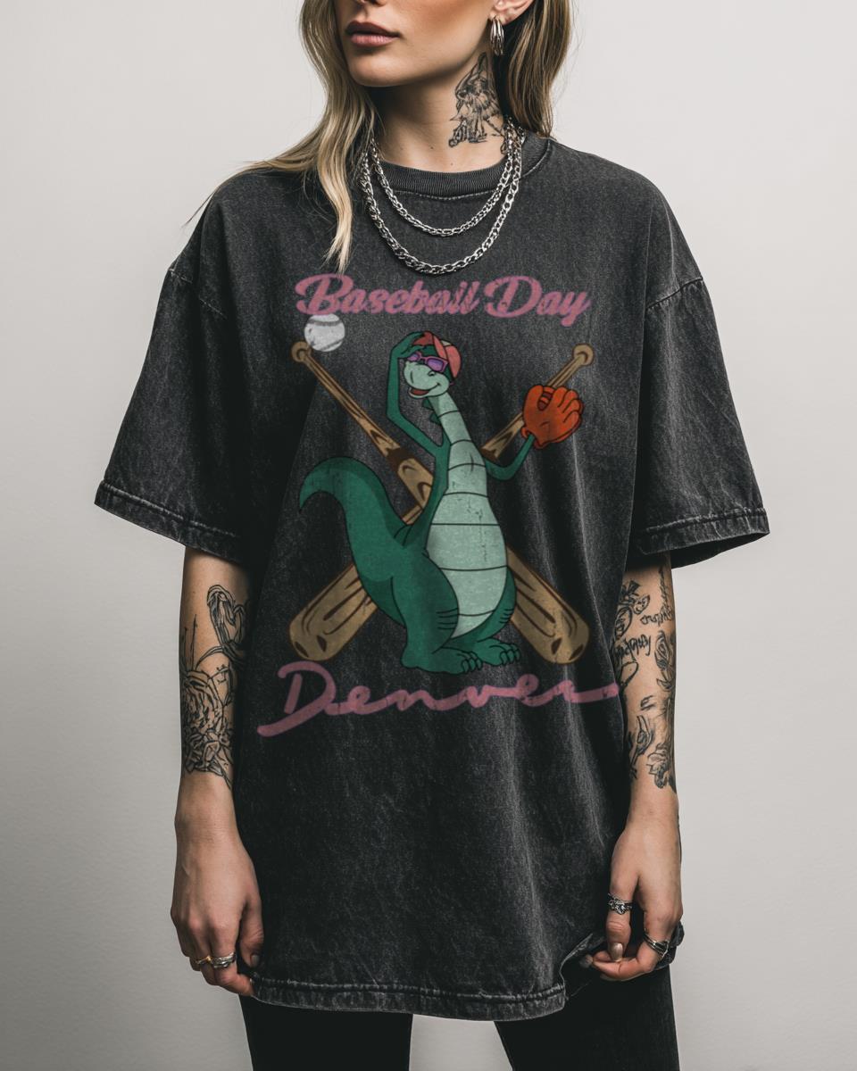 Ready for a blast from the past with a prehistoric twist? Hit a home run with this hilarious ‘Denver The Last Dinosaur Baseball Day’ design! This funny tee features the beloved 80s cartoon dino, Denver, in a playful baseball theme. It’s a nostalgic and cute graphic, perfect for fans of vintage cartoons, dinosaurs, and a…