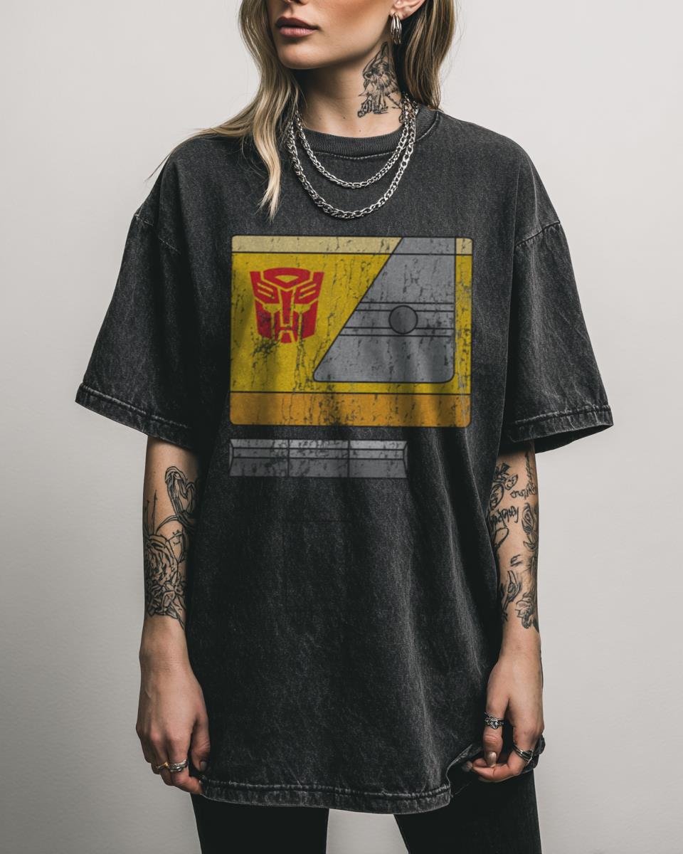 Why is Blaster a Beloved 80s Transformers Autobot? Power up your wardrobe with our Transformers Blaster 80s T-Shirt, a fan-created design celebrating the iconic Autobot from the classic cartoon era. This black acidwash graphic tee, made from 100% heavyweight cotton, is a perfect piece of retro geek apparel. Features of This Retro Transformers Tee: Classic…