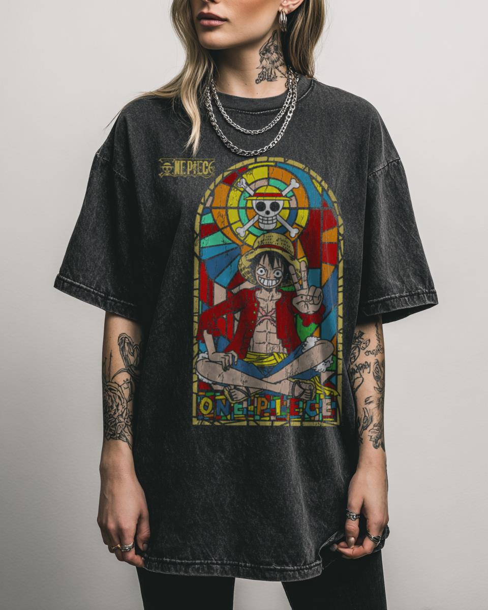 Are you a devoted fan of One Piece and the adventurous Monkey D. Luffy? Behold the Straw Hat Captain in a new light with this stunning t-shirt featuring Monkey D. Luffy in a unique stained glass window art style. This design beautifully merges classic artistry with the thrilling world of One Piece, perfect for manga…