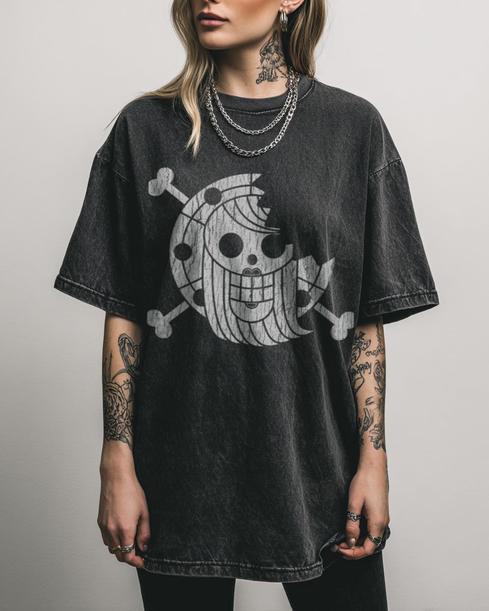 Hoist the Flag with This Bonney Pirates Jolly Roger Tee! Declare your allegiance to the Bonney Pirates with this unique Bonney Pirates Jolly Roger One Piece T-shirt. Featuring a fan-created graphic of their iconic flag on a cool black acidwash fabric, this tee is perfect for any dedicated fan of the Grand Line. Why This…