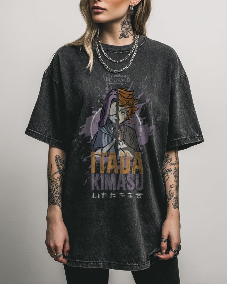 Are you a true fan of the dark and thrilling world of The Promised Neverland? Embrace the intensity of ‘The Promised Neverland’ with this striking grunge-style T-shirt, featuring the ominous ‘Itadakimasu’ phrase. This design captures the chilling atmosphere and desperate struggle for freedom faced by Emma, Norman, and Ray, making it a powerful statement piece…