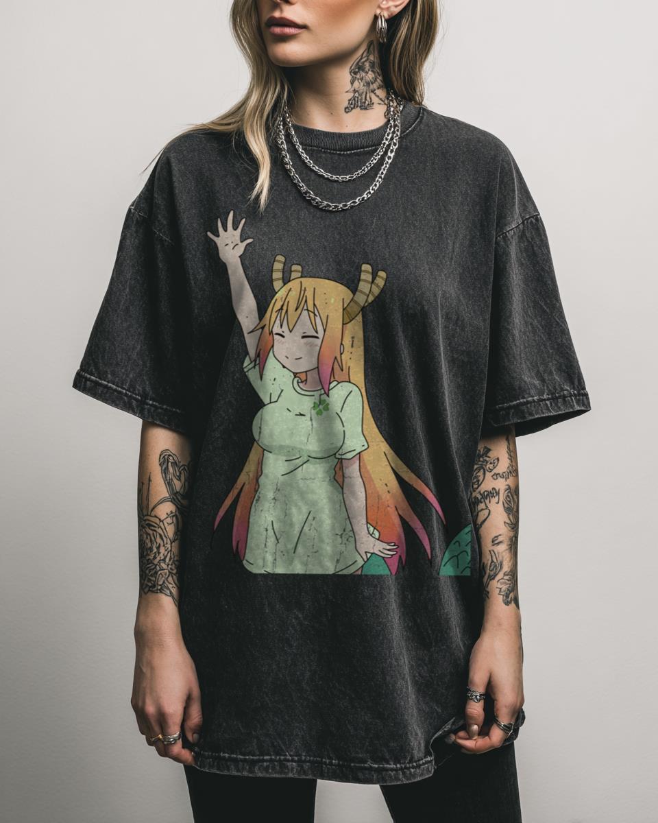 Do you adore the heartwarming antics of Miss Kobayashi’s Dragon Maid? Spread joy with this “Tohru Happy Dragon Maid” design, featuring the cheerful Tohru with a raised hand and a playful wink. Perfect for fans of Kanna, Kobayashi, and Lucoa from the beloved anime and manga series, this shirt captures the cute and comedic spirit…
