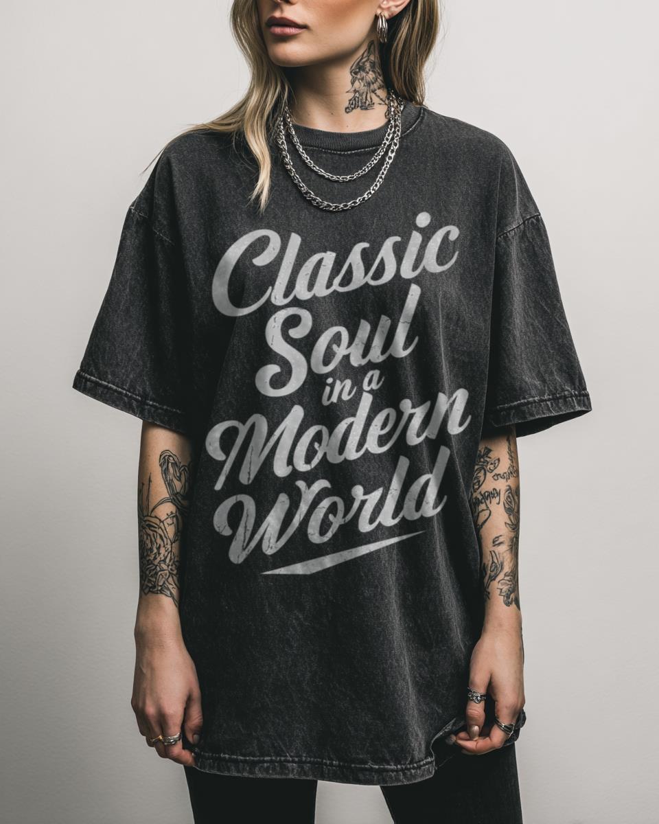 Do you embody a timeless spirit in today’s fast-paced world? This retro-inspired t-shirt features the profound typography ‘Classic Soul in a Modern World, Timeless Spirit’, blending vintage aesthetics with a contemporary message. It’s a powerful statement for those who cherish classic values and iconic wisdom, perfect for individuals with a deep appreciation for enduring style…