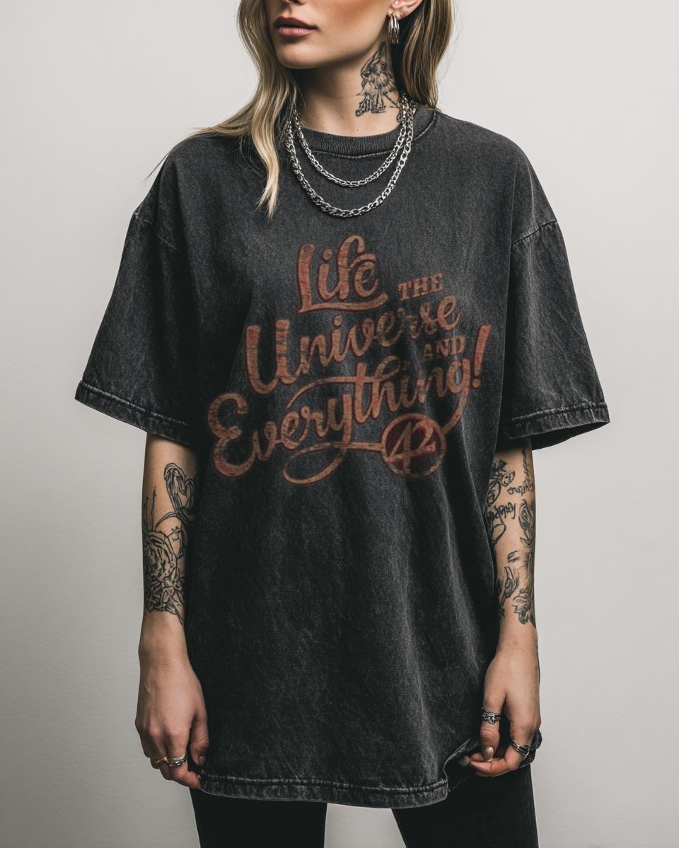 Seeking the Answer to Life? Get This Hitchhiker’s Guide Tee! Don’t panic! Grab this fan-inspired ‘Life the Universe and Everything’ T-shirt, a witty tribute to Douglas Adams’s iconic Hitchhiker’s Guide to the Galaxy. Featuring clever printed graphics on a distinctive black acidwash background, this unisex tee is perfect for any sci-fi geek. Mind-Bending Features of…
