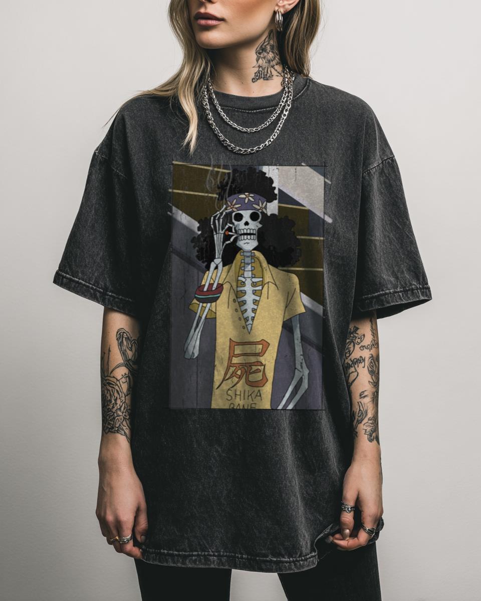 Ready to groove to the tunes of the Soul King, Brook? Catch a chill vibe with this ‘Hippie Brook Smoking’ design from One Piece. This graphic features the Straw Hat musician in a relaxed, hippie-inspired pose, a unique take on the iconic skeleton pirate. Perfect for fans of Brook and the eclectic world of One…