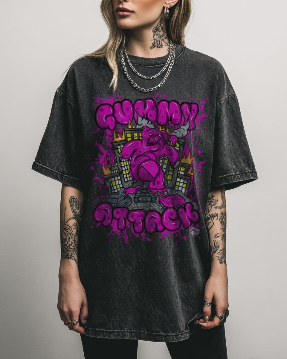 Brace yourself for the sweetest, most ferocious attack! Unleash the ‘Attack of the Gummybear Pink’ T-shirt, featuring an angry, burning, smoking pink gummy bear monster attacking a city! This sweet yet mad cartoon design is a playful take on classic monster movie tropes, perfect for those who love quirky, humorous, and slightly chaotic graphics. A…