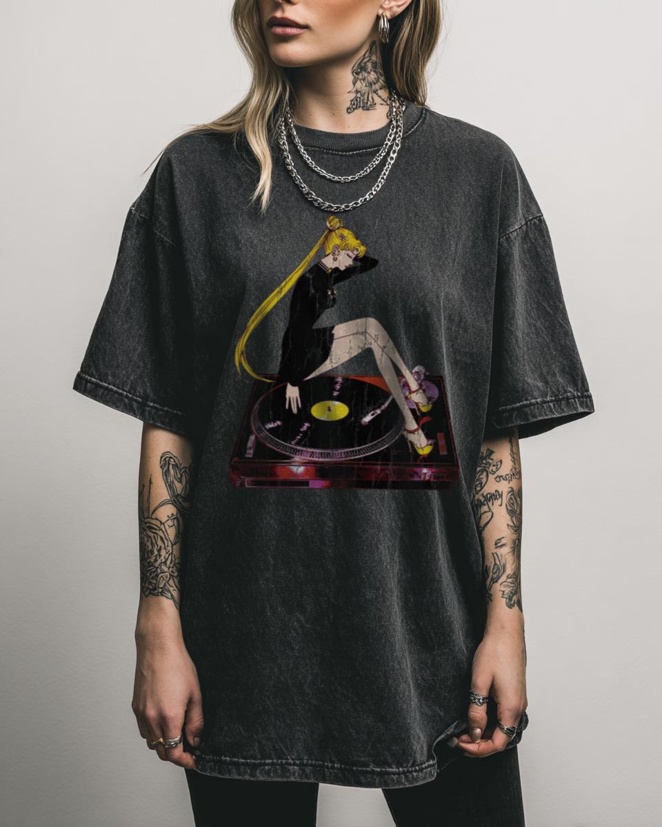Ready to drop the beat with a touch of magical girl power? This “Sailor Spin” design perfectly blends 90s anime aesthetics with a cool DJ vibe, featuring a Moon Princess as a vinyl girl. It’s a vibrant pop art piece, ideal for fans of retro anime, urban style, and anyone who loves music and kawaii…