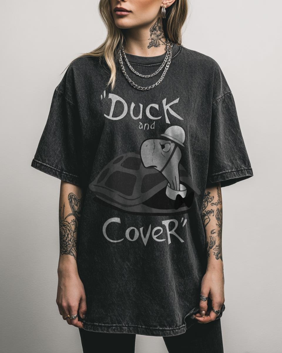 Remember the iconic Cold War era advice for nuclear safety? Step back in time with this ‘Duck and Cover’ graphic t-shirt, featuring the unforgettable Bert the Turtle! This vintage design harks back to the Cold War era’s civil defense public service announcements, offering a darkly humorous and nostalgic look at American history. Perfect for history…