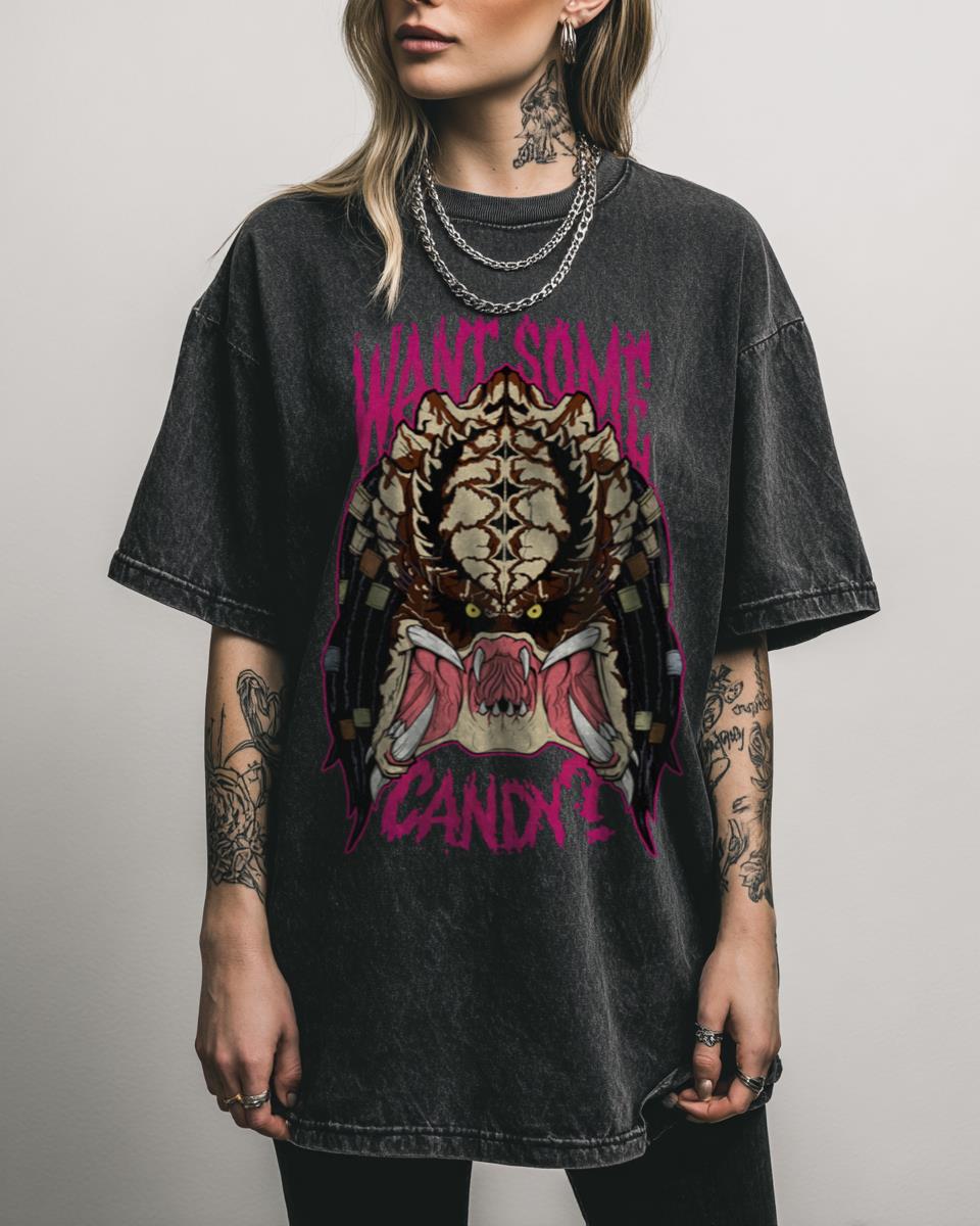 Ready for a classic sci-fi horror throwback? This iconic “Predator ‘Want some candy?’” design puts a playful yet menacing twist on the legendary movie monster. Featuring the Predator with its signature fangs and a cheeky quote, it’s a perfect piece for fans of the classic Arnold Schwarzenegger film, Alien Versus Predator, and vintage sci-fi horror….