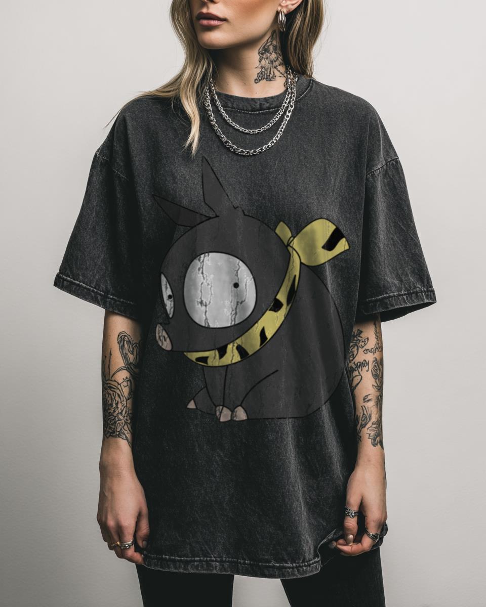 Searching for a charming and nostalgic tribute to classic anime? Celebrate the adorable and hilarious P-Chan (Ryoga Hibiki’s pig form) from Ranma 1/2 with this delightful Black Acidwash T-shirt! This design captures the kawaii essence of Rumiko Takahashi’s beloved character, bringing a touch of classic Japanese animation and humor to your everyday style. It’s a…