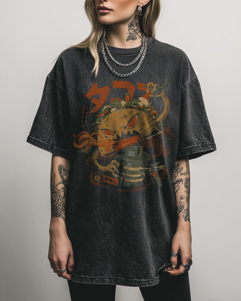 Craving a design that’s as bold and fiery as your favorite dish? Get ready for a flavor explosion with this “Spicy Taco Attack” T-shirt! Featuring an angry, giant taco in a dynamic anime art style, this design by Ilustrata brings a fun, retro Japanese kaiju vibe to Mexican food. It’s a humorous and vibrant tee…
