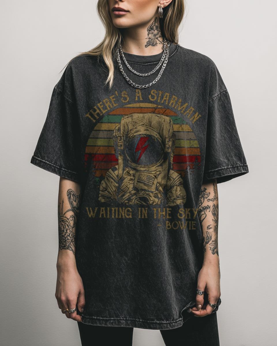 Do you dream of dancing with the Starman and celebrating a music legend? Channel your inner Ziggy Stardust with this electrifying design, paying tribute to the one and only David Bowie. Featuring iconic imagery like the Aladdin Sane lightning bolt and referencing his legendary “Starman” persona, this tee is a must-have for fans of 80s…