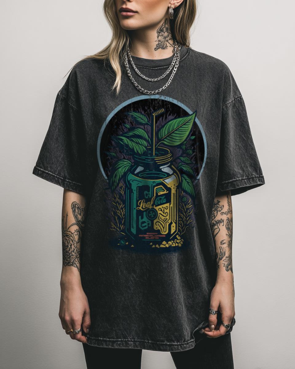 Ready for a refreshing taste of the future, with a retro twist? Quench your thirst for unique style with this ‘Leafcola’ design! This tee features a cool, comic book-inspired graphic of a fizzy, frothy soda, reimagined for a post-apocalyptic world. Blending anime aesthetics with survival themes and plantlife, it’s a fresh take on a classic…