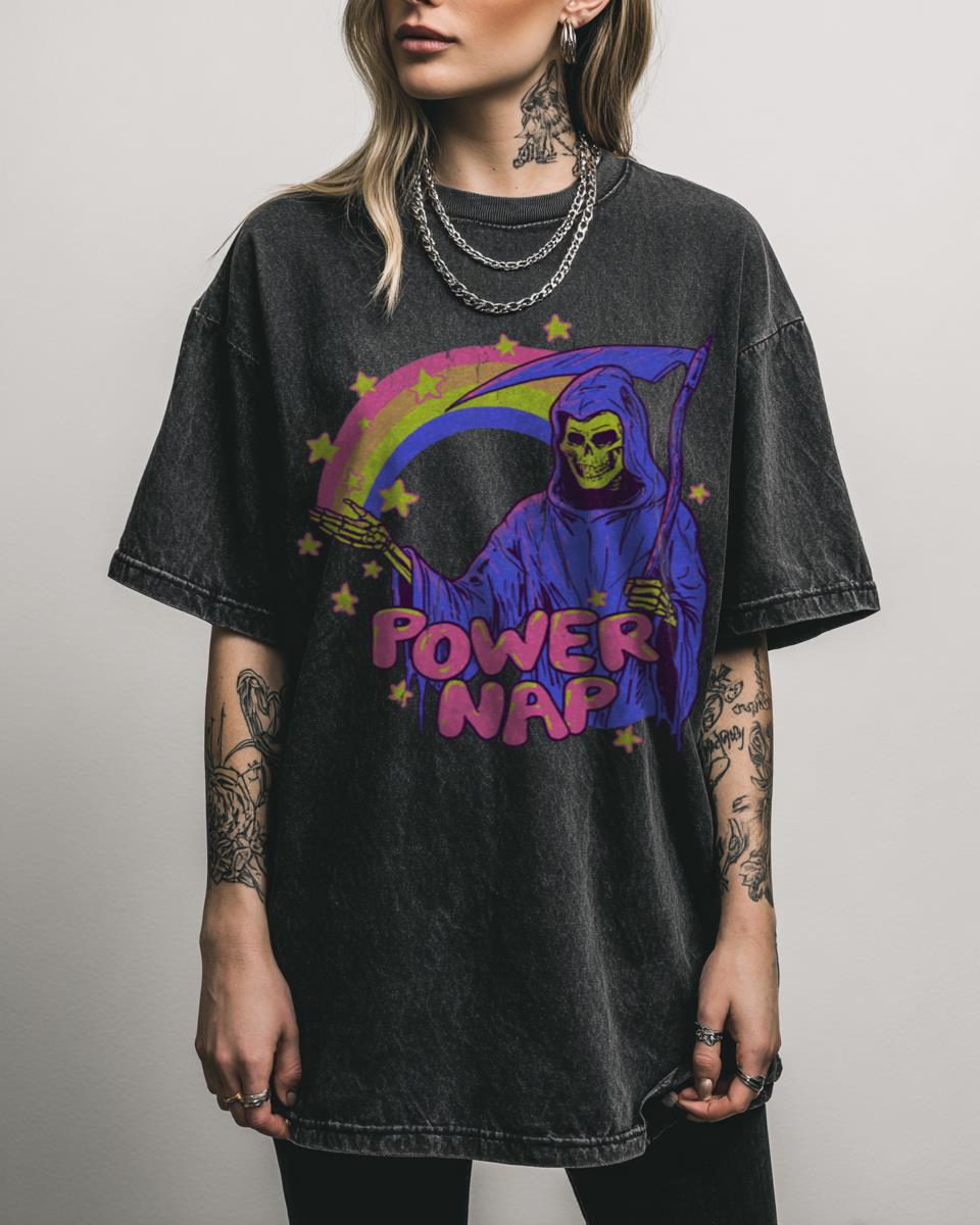 Even the Grim Reaper needs a break sometimes, right? Embrace the ultimate chill with our ‘Power Nap’ T-Shirt! This hilarious retro design features the Grim Reaper himself, taking a well-deserved nap on a vibrant rainbow, complete with a skull for a pillow. It’s a funny, lazy, and totally 80s-inspired graphic for anyone who appreciates dark…
