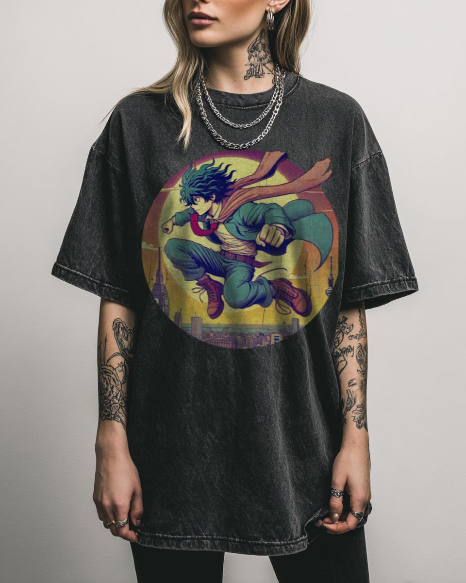 Ready to leap into action with a dynamic retro anime character design? Capture the thrilling essence of classic Shonen Jump manga with this vibrant graphic tee featuring a young anime character mid-jump against a bustling city or school backdrop. This design embodies youthful energy, adventure, and the iconic style of retro Japanese animation, perfect for…