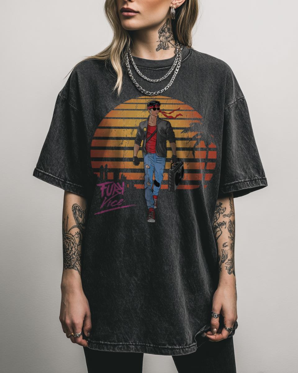 Ready to kick ass and chew bubblegum, 80s style? Step back into the neon-soaked, laser-filled world of the 80s with this ‘Kung Fury Vice’ t-shirt! Inspired by the cult hit ‘Kung Fury’ and classic 80s aesthetics like Miami Vice, this design is a perfect blend of retro cool, martial arts, and over-the-top action. It’s a…