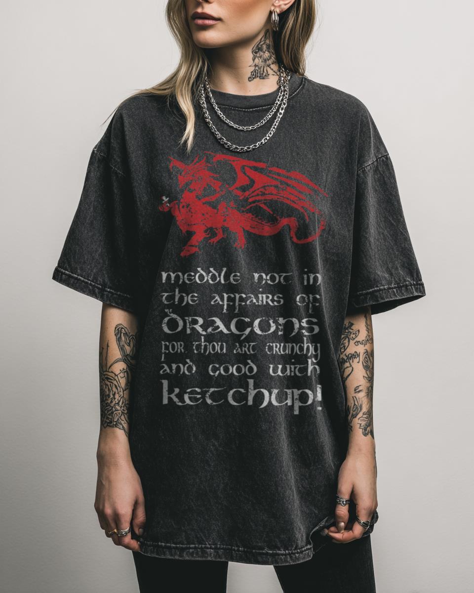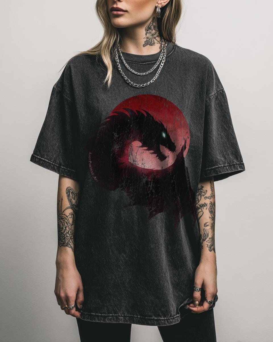 What is the Significance of a Blood Moon Dragon in Fantasy Lore? Unleash your inner adventurer with our Blood Moon Dragon T-Shirt, a fan-created design inspired by the epic fantasy worlds of Dungeons & Dragons and Magic: The Gathering. This black acidwash graphic tee, made from 100% heavyweight cotton, is perfect for any RPG gamer…