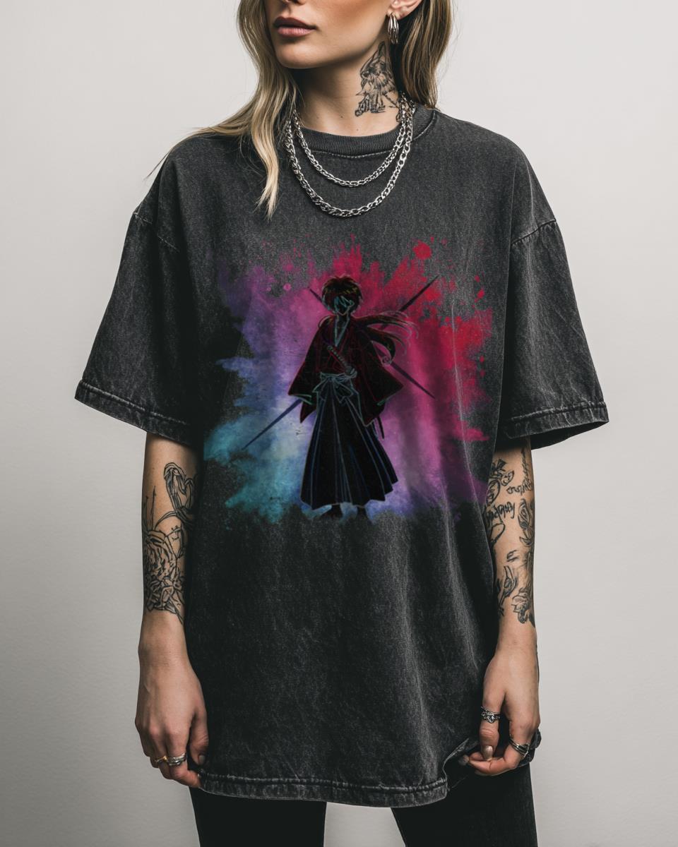 Step back into the golden era of 90s anime with the legendary Battousai! This T-shirt features a dynamic graphic design of Kenshin Himura, the wandering samurai from the iconic 90s anime and manga series ‘Rurouni Kenshin’ (Samurai X). Capturing his stoic determination and legendary sword skills, this design is perfect for fans of classic samurai…