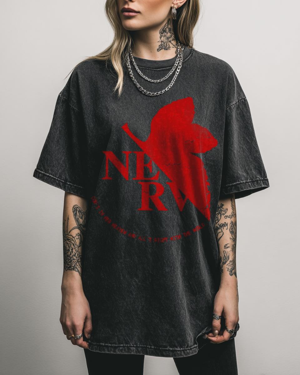 What Makes This NERV Logo Tee Perfect for Evangelion Fans? Declare your connection to the world of mecha and Angels with this NERV logo acidwash T-shirt, a design inspired by Neon Genesis Evangelion. Featuring elements evocative of Shinji Ikari, Unit 01, and Unit 02, this 100% cotton tee is a distinctive piece for any NGE…