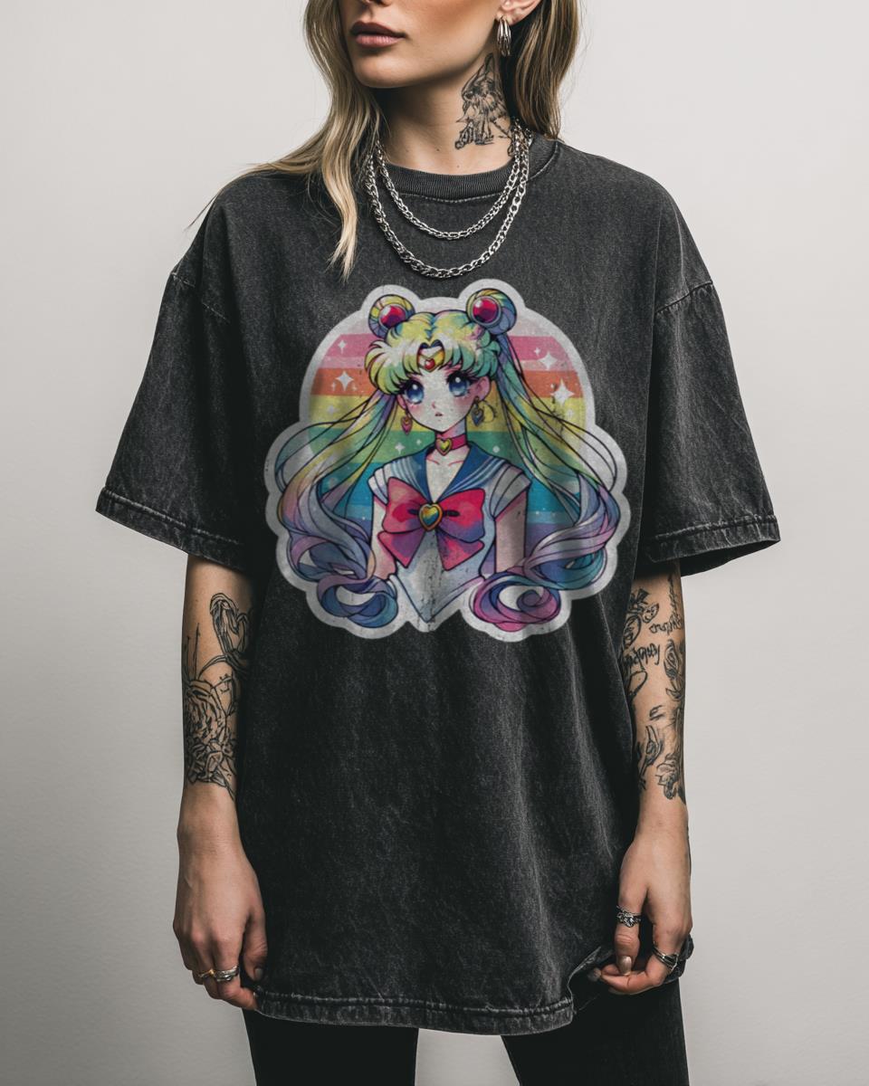 Do you believe in love and justice, and adore cute anime characters? This enchanting ‘Bunny Sailor Moon’ design features Usagi (Sailor Moon) with adorable bunny elements, surrounded by a vibrant rainbow. It’s a charming shojo anime drawing, perfect for fans of Sailor Moon, magical girls, and cute Japanese animation, bringing a touch of whimsical magic…
