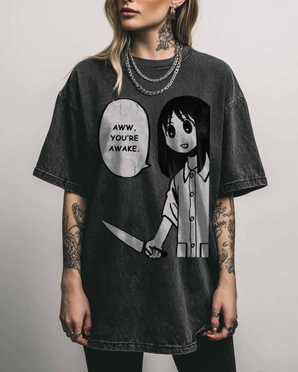 Are you a fan of classic slice-of-life anime with a quirky sense of humor? Relive the hilarious moments of Azumanga Daioh with this unique graphic t-shirt, featuring a re-drawn Osaka manga panel and the iconic ‘Aww you’re awake’ phrase. It’s a nostalgic nod to Ayumu Kasuga’s charmingly eccentric personality, perfect for anime enthusiasts and fans…