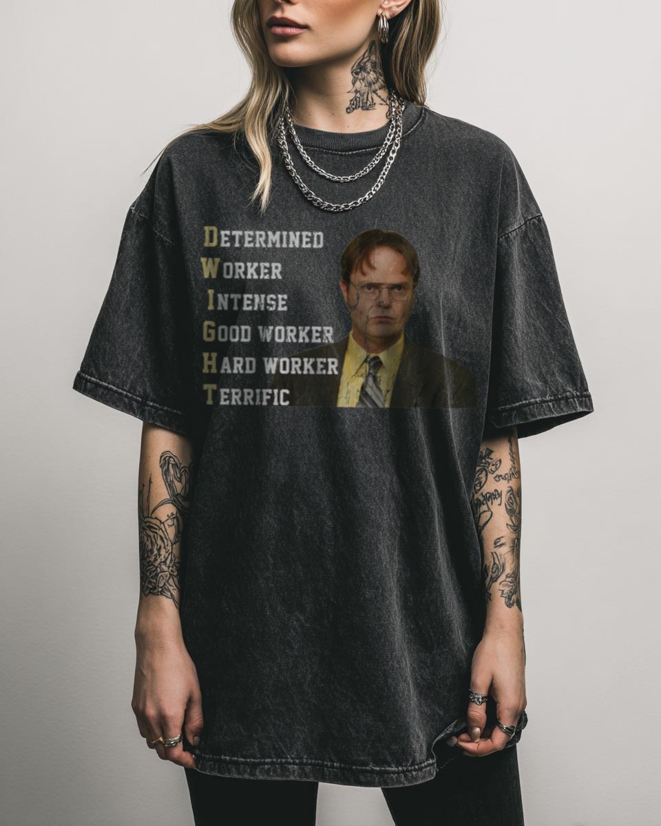 What Defines a Determined Worker? This Dwight Schrute T-Shirt! Embody the spirit of efficiency with this Dwight Schrute The Office T-shirt, featuring his iconic self-description: “Determined. Worker. Intense. Good Worker. Hard Worker. Terrific.” This tee is a must-have for any fan of the beloved Dunder Mifflin paper company and its most dedicated (and peculiar) employee….