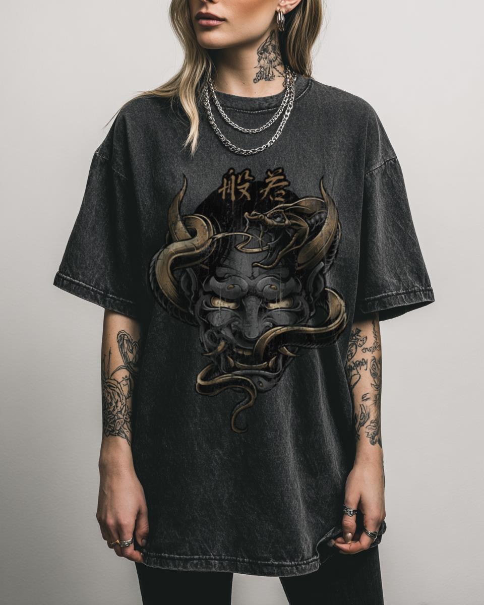What Makes This Hannya Demon Snake Tattoo Tee a Masterpiece? Adorn yourself with the intricate artistry of Japanese tradition with this stunning **Hannya Demon Snake Tattoo Irezumi T-Shirt**. Featuring a captivating graphic inspired by classic Irezumi and Kabuki art, this **black acidwash** tee is perfect for fans of Japanese culture, tattoo aesthetics, and powerful imagery,…
