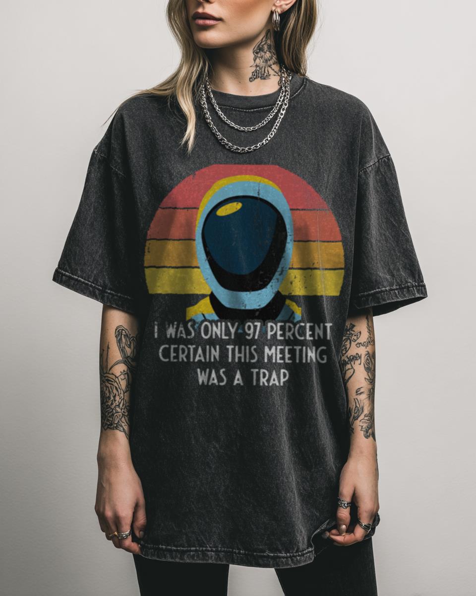 Why Choose This Murderbot Diaries SecUnit Trap T-Shirt? Express your inner SecUnit with this Murderbot Diaries “97 Percent Sure Meeting Is a Trap” fan art t-shirt. Featuring a witty graphic on a black acidwash background, this tee is perfect for fans who appreciate Murderbot’s cynical charm and Martha Wells’ universe. Highlights of This Sci-Fi Graphic…