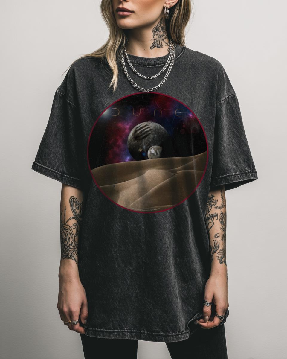 Dreaming of the vast, sandy plains and twin moons of Arrakis? Transport yourself to the desert planet with this breathtaking “Dune Landscape with Moons of Arrakis and Nebula” T-shirt. This stunning design captures the epic scale and cosmic beauty of the Dune universe, featuring the iconic moons and a distant nebula over the sandscape. Perfect…
