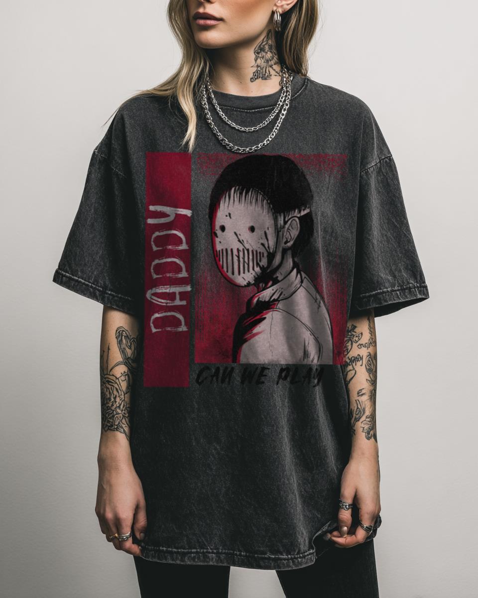 Do you dare to wear a design that’s both eerie and intriguing? Unleash a touch of the macabre with this ‘Daddy Can We Play’ horror anime T-shirt. Featuring a haunting creature with piercing red eyes, this design evokes a chilling, nightmare-like atmosphere. It’s a perfect blend of spooky fun and anime aesthetic, ideal for those…