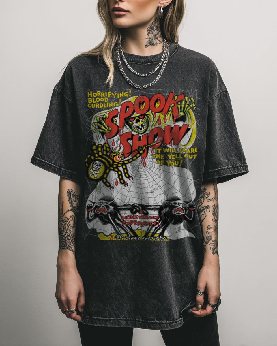 Step right up, ladies and gentlemen, to the most monstrously fun ‘SPOOK SHOW’ in town! This ‘SPOOK SHOW!’ design by Phil Postma features a vibrant, retro-inspired cartoon graphic, possibly showcasing a playful array of classic monsters. It’s a fun and unique piece for horror and animation art enthusiasts. Why You’ll Love This T-Shirt: Retro ‘Spook…