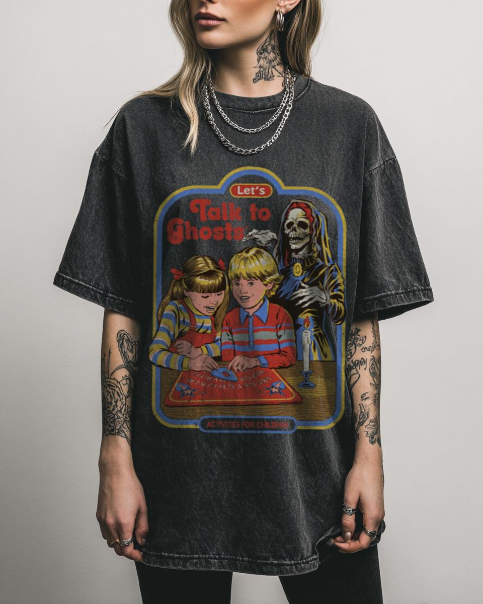Ready for a Seance? The “Let’s Talk to Ghosts” Tee! Channel your inner medium with this ‘Let’s Talk to Ghosts’ T-shirt, a fun and spooky nod to retro occult themes and Ouija boards. Featuring intriguing printed graphics on a distinctive black acidwash background, this unisex tee is perfect for fans of vintage horror and dark…