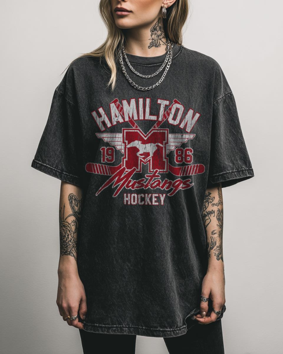 Relive the Glory with the Hamilton Mustangs Youngblood Hockey Tee? Step back into the 80s with this **Hamilton Mustangs Hockey T-Shirt**, inspired by the classic movie Youngblood. Featuring a unique **black acidwash** finish and a vintage-style graphic, this unisex tee is a must-have for fans of retro cinema and junior hockey legends like Keanu Reeves…