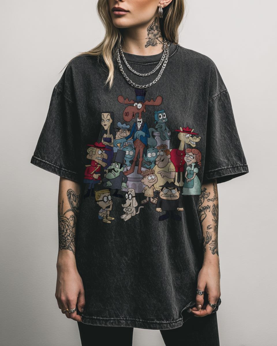 Are you a fan of classic animated antics from the golden age of cartoons? Celebrate the timeless humor of Jay Ward with this ‘Tributes to Jay Ward Cartoons Rocky, Bullwinkle, and Friends’ T-shirt! This design features beloved characters like Rocky, Bullwinkle, Mr. Peabody, Sherman, Boris, and Natasha, perfect for fans of vintage cartoons and pop…