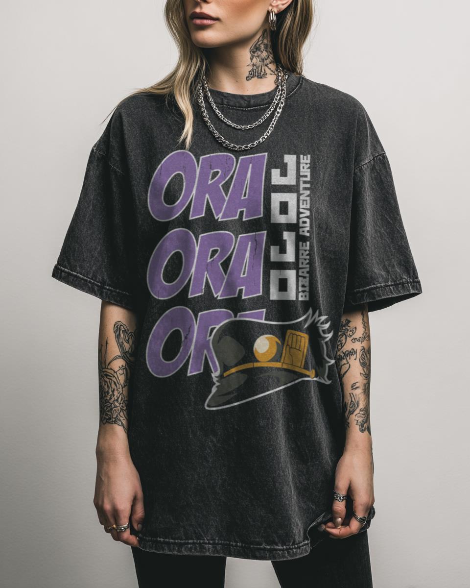 Are you ready to unleash your inner Stand user? Step into the world of JoJo’s Bizarre Adventure with this dynamic ‘Ora Ora Ora’ anime graphic T-shirt. Featuring the iconic battle cry of Jotaro Kujo’s Star Platinum, this design captures the raw power and intensity of your favorite Stand user’s most memorable moments. Perfect for conventions,…