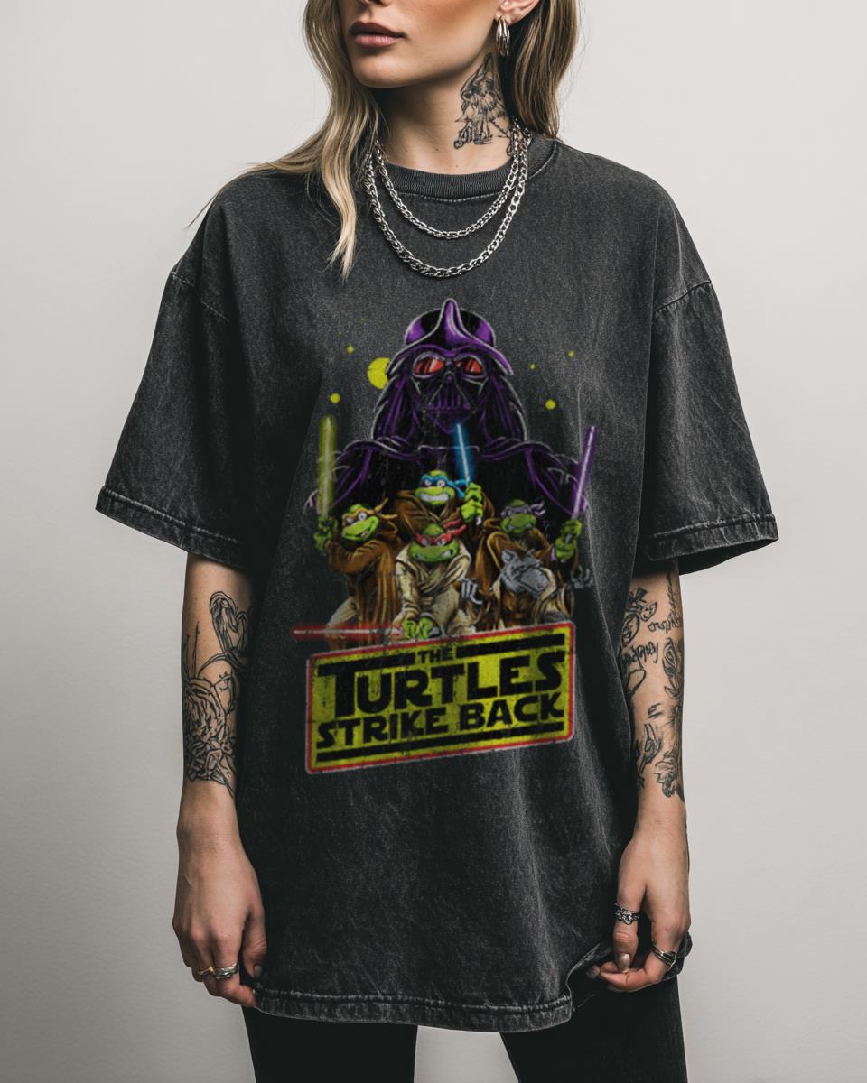 What Makes This “Turtles Strike Back” TMNT Parody T-Shirt So Funny? Get ready for an epic crossover with this hilarious “Turtles Strike Back” TMNT Parody T-Shirt! This acidwash black graphic tee features Mikey and Raphael in a brilliant parody of a classic sci-fi movie, blending the worlds of Teenage Mutant Ninja Turtles and Star Wars….