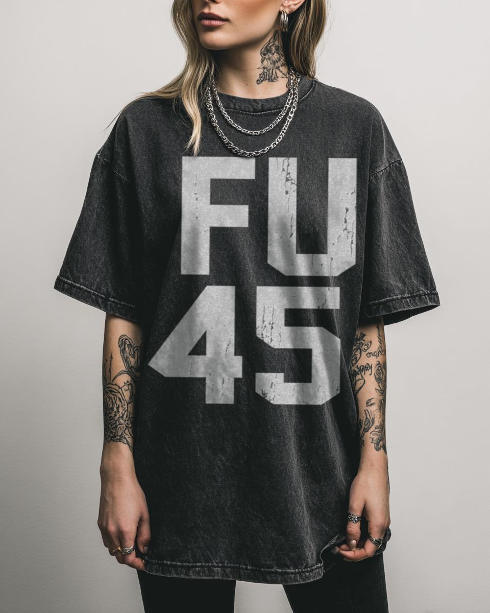 Ready to make a clear political statement with your apparel? This ‘FU45’ T-shirt is a bold and direct expression of anti-Donald Trump sentiment, utilizing the popular ‘8645’ and ‘Byedon’ slogans. It’s a powerful statement piece for those who stand in opposition to the 45th president. Why You’ll Love This: Bold ‘FU45’ anti-Trump printed graphics Soft…