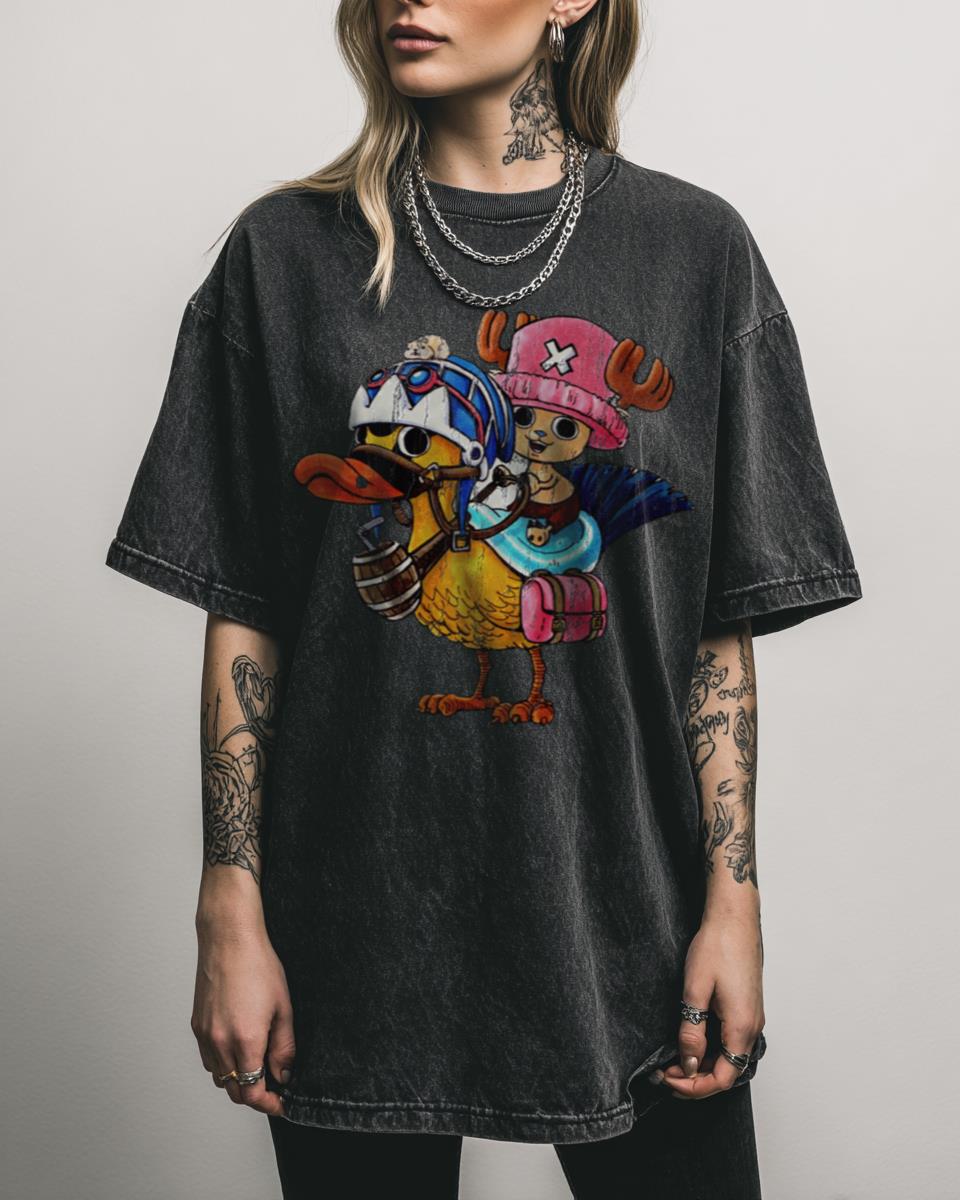 Are you a One Piece fan who cherishes the loyal companions of the Straw Hat Pirates? Celebrate the adorable and brave Karoo, Princess Vivi’s loyal super spot-billed duck, with this “Karoo Vivi” graphic tee from One Piece. This design captures the beloved character, perfect for fans who appreciate the unique charm of Alabasta’s feathered friend…