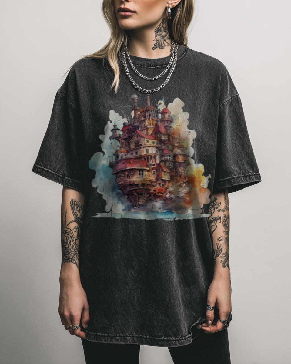 Dreaming of a magical home that travels across landscapes? This charming ‘Howl’s House’ design brings the enchanting world of Studio Ghibli’s ‘Howl’s Moving Castle’ to life. Featuring key elements and characters like Calcifer, Sophie, and the iconic moving fortress, this graphic is a delightful tribute to Miyazaki’s imaginative storytelling. A perfect piece for any anime…