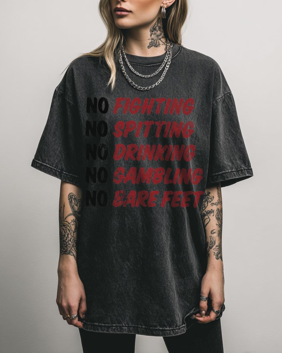 Searching for a Caddyshack Movie Quote T-Shirt? Embody the irreverent humor of a classic film with our **No Fighting, No Spitting, No Drinking, No Gambling, No Bare Feet T-Shirt**, a fan-created graphic tee for movie buffs. This black acidwash shirt features a memorable quote from Caddyshack, making it a perfect piece for fans of Bill…