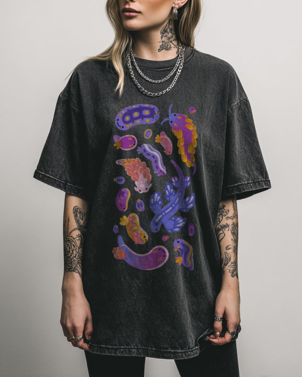 Why is This Pastel Sea Slug T-Shirt So Charming? Dive into adorable marine biology with this Cute Pastel Sea Slug T-shirt, featuring a charming nudibranch graphic. This unique design celebrates the beauty of marine life on a distinct black acidwash tee, perfect for ocean lovers, science enthusiasts, and anyone who appreciates cute animal art. Key…