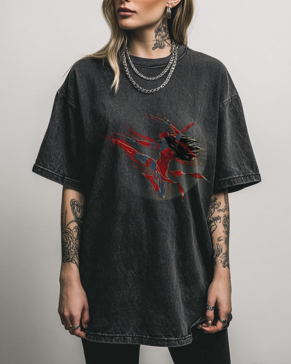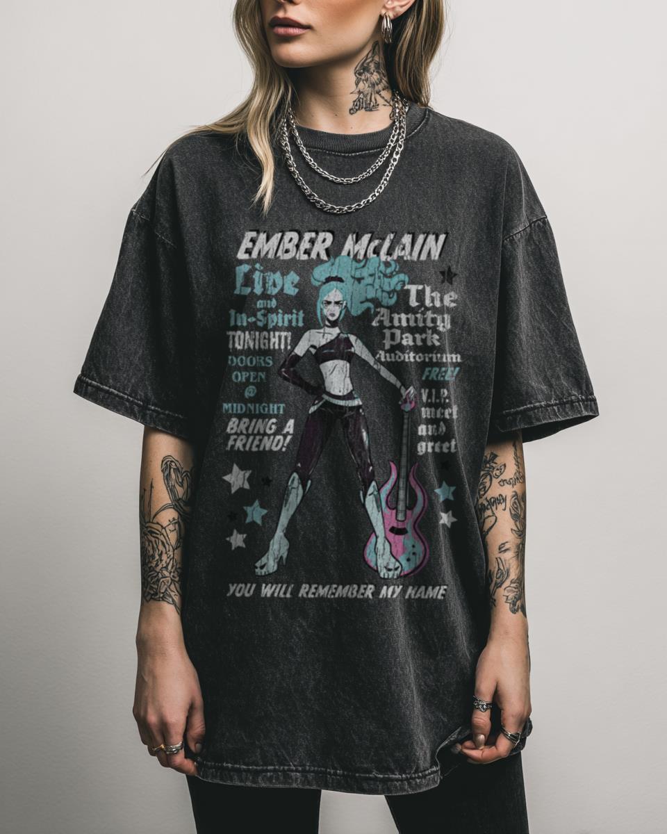 Rock Out with This Ember McLain Danny Phantom T-Shirt? Rock out with your favorite ghost rocker in this awesome **Ember McLain Danny Phantom T-shirt**. Featuring a vibrant fan-created design by KinneyMary, this **black acidwash** tee is a perfect tribute to the beloved cartoon character. Why This Cartoon Fan Art Tee is a Must-Have: **Dynamic Character…