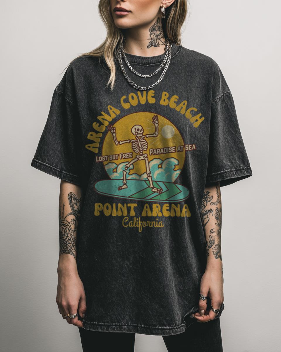Yearning for the groovy vibes of California’s Sixties beach culture? Catch a wave of nostalgia with this ‘Retro Sixties Arena Cove Beach, California’ graphic tee. Featuring a vintage-inspired design with a hint of skeleton surf art, this shirt captures the cool, laid-back essence of classic California beaches. It’s perfect for surf enthusiasts, beach lovers, and…